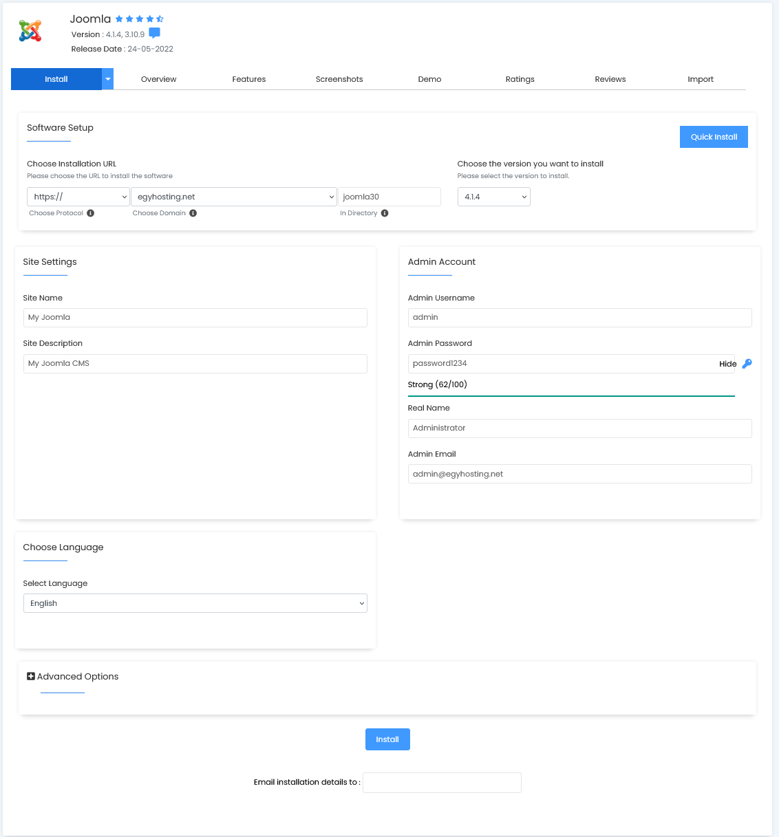 املأ التكوين الأساسي مثل عنوان URL الخاص بالتثبيت واللغة. تأكد أيضًا من كتابة البريد الإلكتروني للمسؤول واسم المستخدم وكلمة المرور. ثم انقر فوق زر التثبيت.